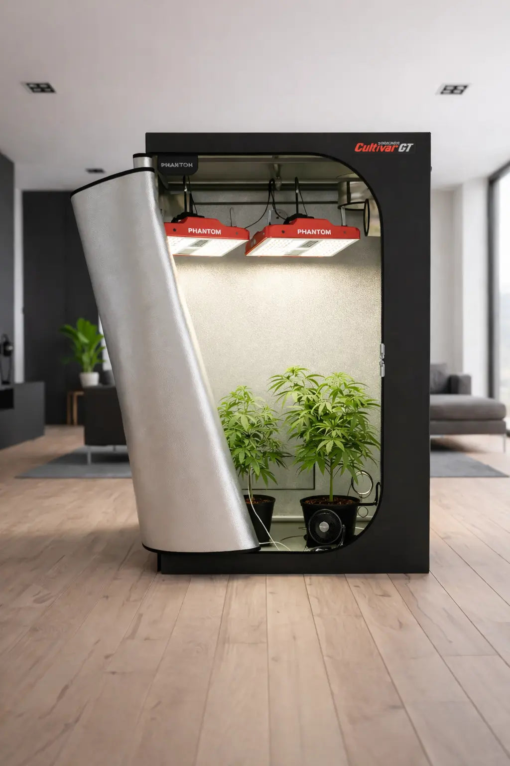 - Carpa Phantom Cultivar Tent 4x4 (GT44) – estructura de acero, lona 1680D antifugas, interior mylar diamante, puertos sellables y zippers industriales.